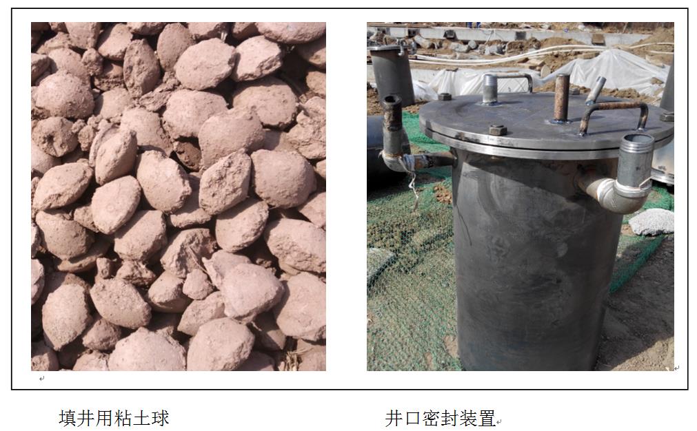 井口地面以下第一層水標(biāo)高以上位置井管外采用粘土球回填,用水夯實;井口部位采用專用封井裝置密封。